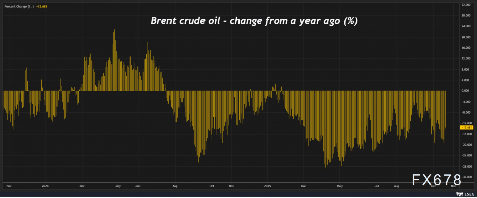 (图:趋势就业增长自年初以来大幅放缓)   美联储显然已意识到这一风险。鲍威尔主席上月明确表示,尽管通胀仍高于2%的目标,但对劳动力市场快速恶化的担忧促使美联储决定重启降息周期。这一表态标志着美联储政策框架的重要转变,就业市场的稳定已成为比通胀控制更优先的政策目标。   此外,美联储与投资者可能还有其他理由对依然高企的通胀率保持“视而不见”的态度。油市传递的信号就是其中之一。虽然原油价格与通胀的关联度已不及往昔,但其指示作用仍不可忽视。当前油价在五个月低点(60.05美元/桶)附近上方震荡,布伦特原油价格约每桶65.10美元,较去年同期下跌约15%。