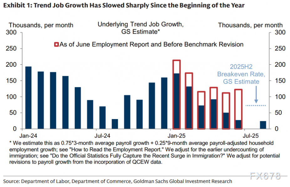 (图:美国10年期国债收益率创2024年10月3日以来最低收盘水平)   在政府停摆、官方数据缺位的情况下,投资者只能依靠自身对经济前景的研判来填补信息真空。而最令市场忧心忡忡的,莫过于就业增长势头的急剧放缓。尽管就业岗位增长大幅减速的现象,迄今为止主要被劳动力供给收缩所抵消,但这一趋势依然令人不安。   高盛经济学家本周系统阐述了就业增长快速萎缩的五大成因:移民流入放缓、政府招聘与资金缩减、人工智能技术应用普及、关税成本与贸易不确定性上升,以及宏观经济增长风险加剧。据其测算,当前潜在趋势就业增长已降至每月仅2.5万人,较1月份预测大幅减少约12.5万人。