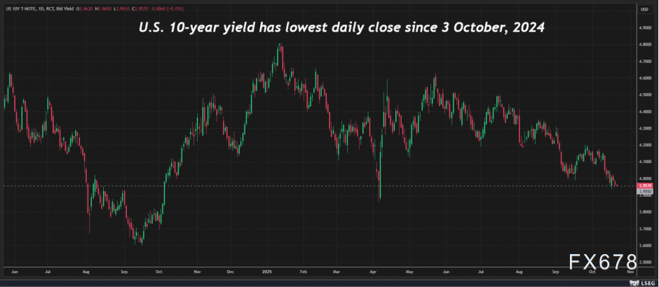 这种共识可能引发自我强化的反馈循环——就业市场忧虑压低了收益率,而收益率的下降又加剧了对经济放缓的担忧,进而对收益率形成持续的下行压力。在这种循环机制下,任何关于就业市场的负面消息都可能被放大,导致市场波动加剧。   周四(10月23日)美国政府停摆已进入第23天,参议院先后12次否决临时拨款决议,政治僵局仍无缓解迹象。在停摆期间,官方经济数据全面缺失,使得本周五即将公布的消费者物价指数(CPI)成为市场瞩目的焦点。然而,这个备受期待的数据可能无法提供投资者真正需要的信息。   市场预期,9月核心通胀率将维持在3.1%的水平,这较美联储2%的通胀目标高出逾一个百分点。值得关注的是,近五年来,核心CPI同比涨幅几乎每个月都站在3%或以上的高位。   然而,债券市场对此可能反应冷淡。两年期美债收益率上周跌至2022年8月以来最低水平,反映出市场预期美联储将在下周会议、12月及明年继续降息。   10年期美债收益率也已跌破4%关口,周二创下一年多来最低收盘水平。这些迹象表明,即便通胀数据超出预期,也难以扭转收益率的下行趋势。债市的技术面表现显示,投资者已经对未来经济前景形成了相对一致的悲观预期。