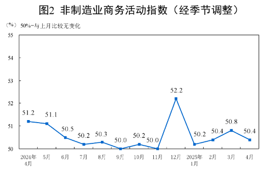 4月份,非制造业商务活动指数为50.4%,比上月下降0.4个百分点,仍高于临界点,非制造业总体继续保持扩张。