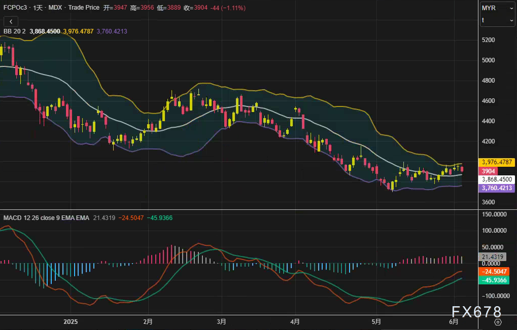 周四(6月5日)马来西亚衍生品交易所(BMD)棕榈油主力合约FCPOc3今日收跌1.11%,报3904林吉特/吨,终结此前两日连涨。技术面上,布林通道(20,2)中轨位于3976林吉特,MACD柱状图虽仍处负值区间但绿柱收窄,显示短期调整压力尚未完全释放。