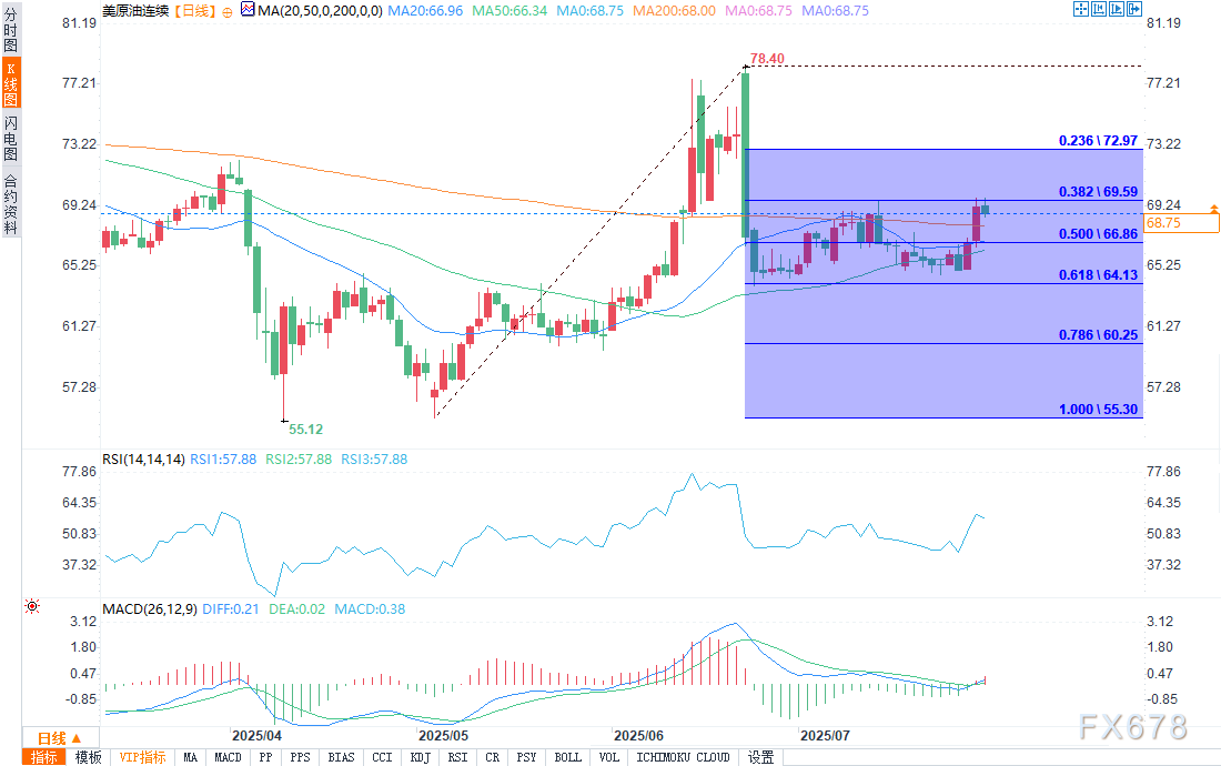 周三(7月30日),WTI原油期货回落,因未能突破关键阻力位69.59美元,这一水平已连续两个交易日限制涨幅,且是决定方向动量的关键触发点。价格仍在区间内盘整,等待突破催化剂的出现。