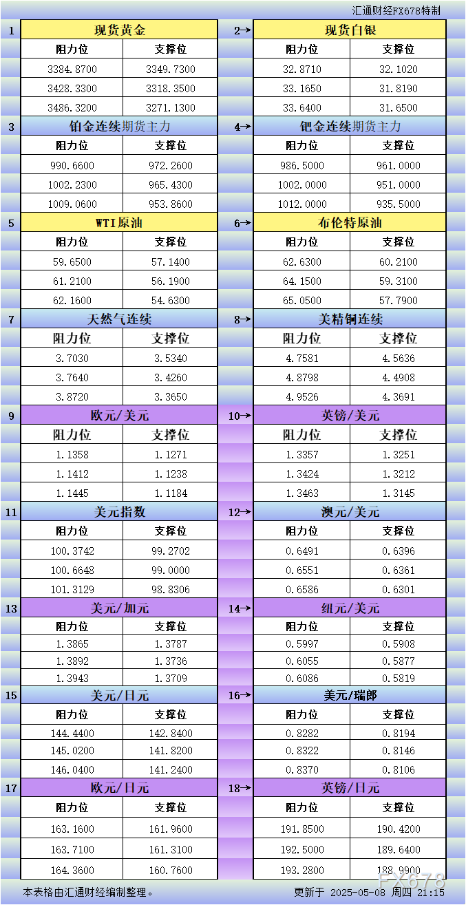 嘉盛外汇官网;5月8日美市更新支撑阻力:18品种支撑阻力(金银铂钯原油天然气铜及